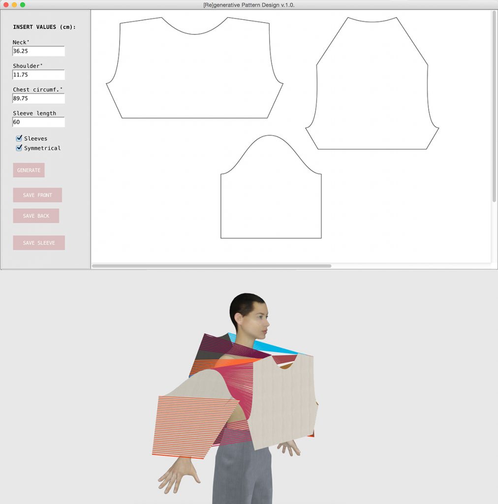 On the other hand, there is currently a lack of research on the development of innovative digital pattern cutting techniques. Therefore, the other tool, [Re]gPD, proposes a different but supplementary way of using digital technology in pattern cutting. The tool developed creates unusual bodice blocks given a set of body measurements. It can generate infinite bodice blocks for a single set. The generative design framework chosen implies an approach to pattern cutting that could not be implemented manually. The aim is to open a way for the pattern cutting discipline to advance by challenging traditional fashion design processes. The code uses algorithms based on traditional pattern cutting rules that the software itself breaks. The three-dimensional shape that [Re]gPD blocks produce when sewn is difficult to envisage by simply looking at the flat shapes. Therefore, although the software generates two-dimensional shapes, it encourages a subsequent 3D draping process (that could be performed physically or virtually).